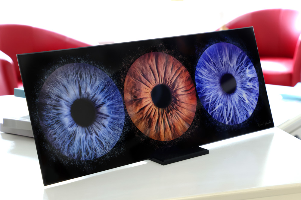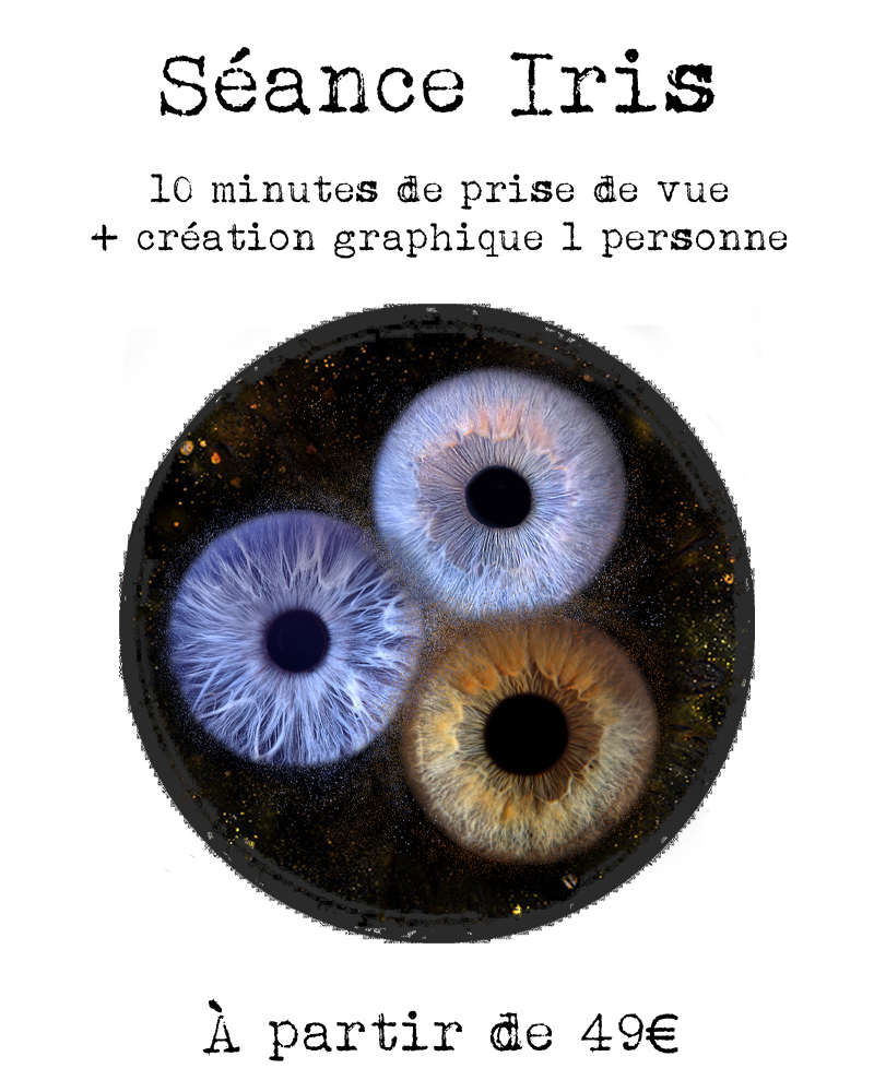 Frais de séance comprenant la prise de vue en studio pour 1 personne + création graphique personnalisée. Ajoutez 15€ par personne supplémentaire, maximum 6 personnes. Création graphique, version numérique offerte, non imprimable. Support plexi haute qualité, à partir de 99€, format carré, rectangulaire ou panoramique, en fonction du nombre d'iris. (Voir les tarifs dans la rubrique "Nos Collections" ou en boutique).